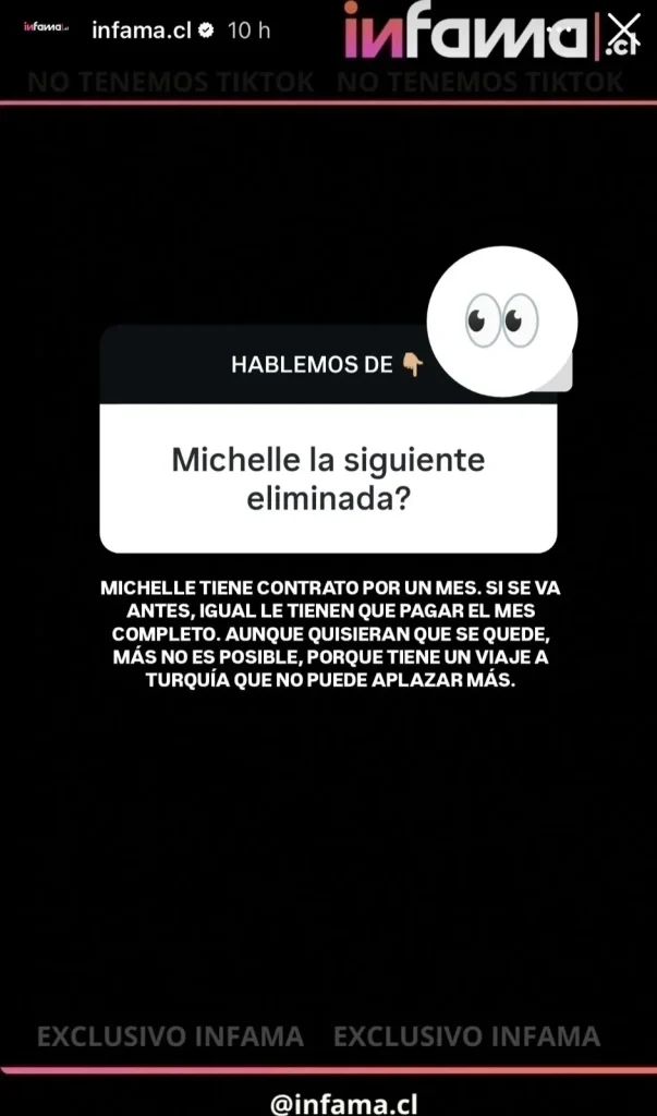 El sitio Infama abrió en Instagram su clásica caja de preguntas, donde un usuario consultó si Michelle Carvalho sería la próxima eliminada de "Fiebre de Baile" en Chilevisión.